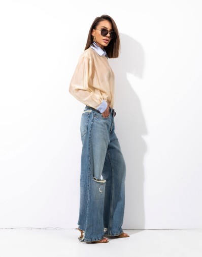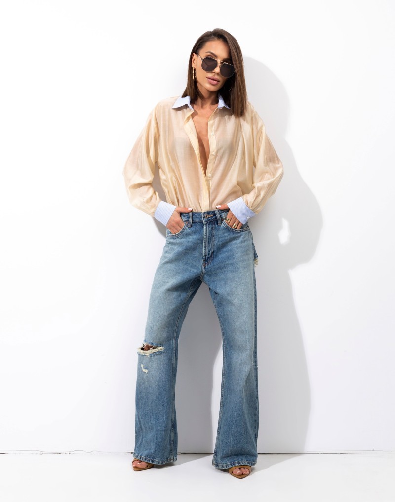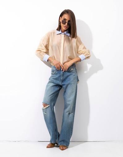 Modna koszula o luźnym, oversize’owym kroju w beżowym odcieniu. Kontrastowy, jasnoniebieski kołnierzyk i mankiety nadają jej oryginalnego charakteru i podkreślają nowoczesny styl. Zapinana po długości na kryte guziki.Wykonana z lekkiego, przyjemnego w noszeniu materiału, świetnie sprawdzi się w codziennych stylizacjach – zarówno z jeansami, jak i eleganckimi spodniami. Idealna dla kobiet ceniących wygodę i modny look.