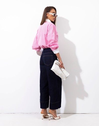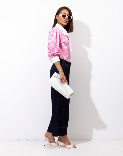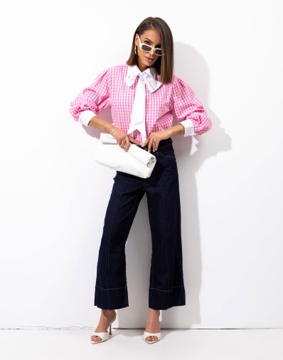 Stylowa koszula w modny, różowy wzór w kratę, która przyciąga uwagę i dodaje charakteru każdej stylizacji. Wyjątkowym elementem jest elegancka, biała , zdejmowana kokarda przy dekolcie oraz kontrastowe mankiety, które podkreślają jej oryginalny design. Zapinana po długości na guziki.Lekko luźny fason zapewnia komfort noszenia, a jednocześnie prezentuje się bardzo kobieco. Idealna zarówno do codziennych stylizacji, jak i na bardziej wyjątkowe okazje.