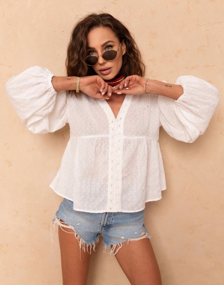 Delikatna, kobieca bluzka w odcieniu klasycznej bieli, wykonana z lekkiego, zwiewnego materiału z subtelną fakturą. Model wyróżnia się efektownym dekoltem w kształcie litery V oraz ozdobnym wykończeniem, które nadaje całości eleganckiego charakteru. Bufiaste rękawy na gumce dodają romantycznego stylu i lekkości sylwetce. Idealna zarówno do codziennych stylizacji, jak i na bardziej wyjątkowe okazje.