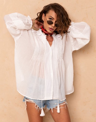 Lekka i stylowa koszula w kolorze białym, wykonana z delikatnego, przewiewnego materiału. Model wyróżnia się subtelnymi marszczeniami na przodzie oraz romantyczną falbanką przy dekolcie, które nadają jej kobiecego, boho charakteru. Luźny krój zapewnia komfort noszenia i swobodę ruchów, a długie rękawy z dekoracyjnymi przeszyciami dodają całości wyjątkowego stylu. Idealna zarówno na co dzień, jak i na bardziej eleganckie okazje.