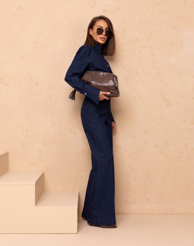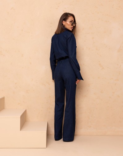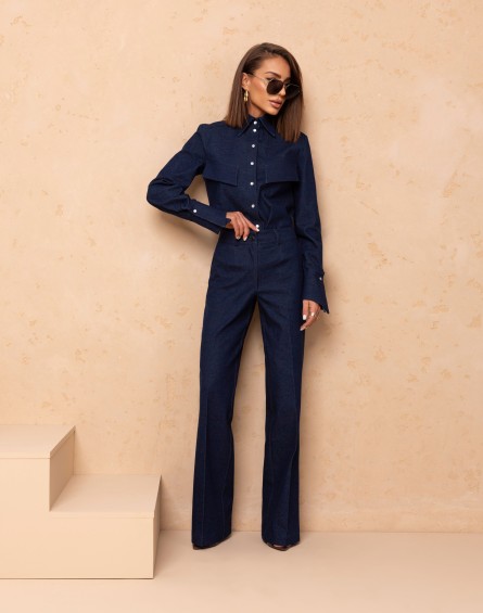 Bawełniany komplet w granatowym dżinsie.Klasyczna koszula damska zapinana na kryte guziki to ponadczasowa baza do wielu stylizacji. Model z klasycznym kołnierzem, długim rękawem zakończonym dłuższym mankietem oraz ozdobnymi patkami z przodu, które nadają całości subtelnego charakteru.Spodnie z rozszerzaną nogawką. W pasie szlufki. Przód zapinany na klasyczne zapięcie. Z przodu wsuwane kieszenie. Z tyłu patki.