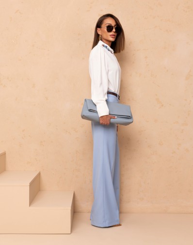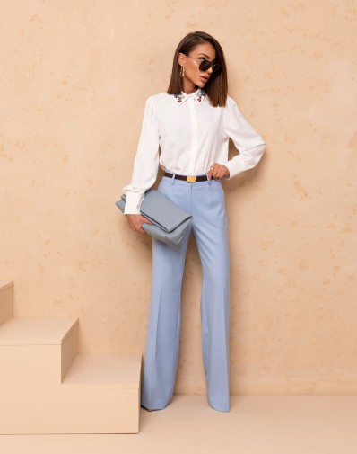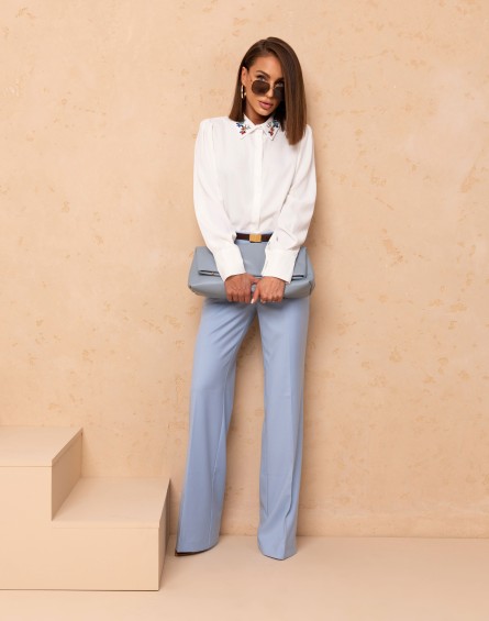 Klasyczna koszula z kołnierzem ozdobionym kolorowymi cyrkoniami i guzikami na całej długości. Luźny fason z zaokrąglonym wykończeniem. Długi rękaw zakończony szerokim mankietem oraz delikatne zakładki na ramionach. Must have w każdej kobiecej szafie.