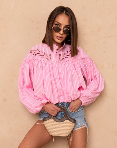 Stylowa koszula o luźnym kroju, wyróżniająca się efektowną koronką oraz haftowanym wykończeniem. Dół zakończony gumką tworzy modny efekt „bombki”, dzięki czemu koszula świetnie układa się na sylwetce. Delikatny wzór białych pasków nadaje jej delikatności.Lekka i przyjemna w noszeniu, idealna zarówno na co dzień, jak i do bardziej eleganckich stylizacji.