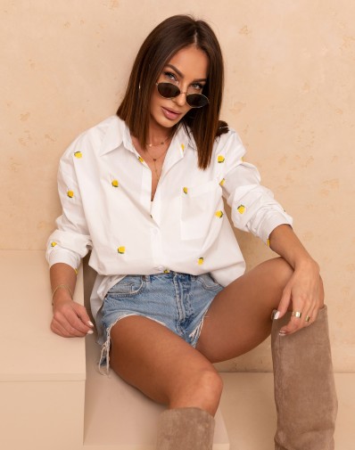 Stylowa koszula z bawełnianej tkaniny o klasycznym kroju z motywem wyszywanych cytrynek . Wykonana z miękkiego, przyjemnego w dotyku materiału, który zapewnia wygodę przez cały dzień. Model zapinany na guziki z klasycznym kołnierzykiem i mankietami przy rękawach.Tył delikatnie dłuższy.Doskonale sprawdzi się w casualowych stylizacjach – noś ją z jeansami, topem lub jako lekką narzutkę.