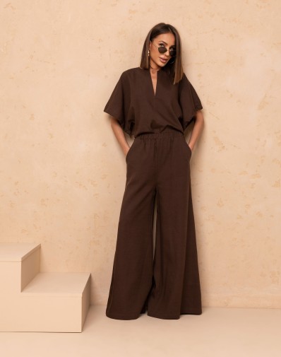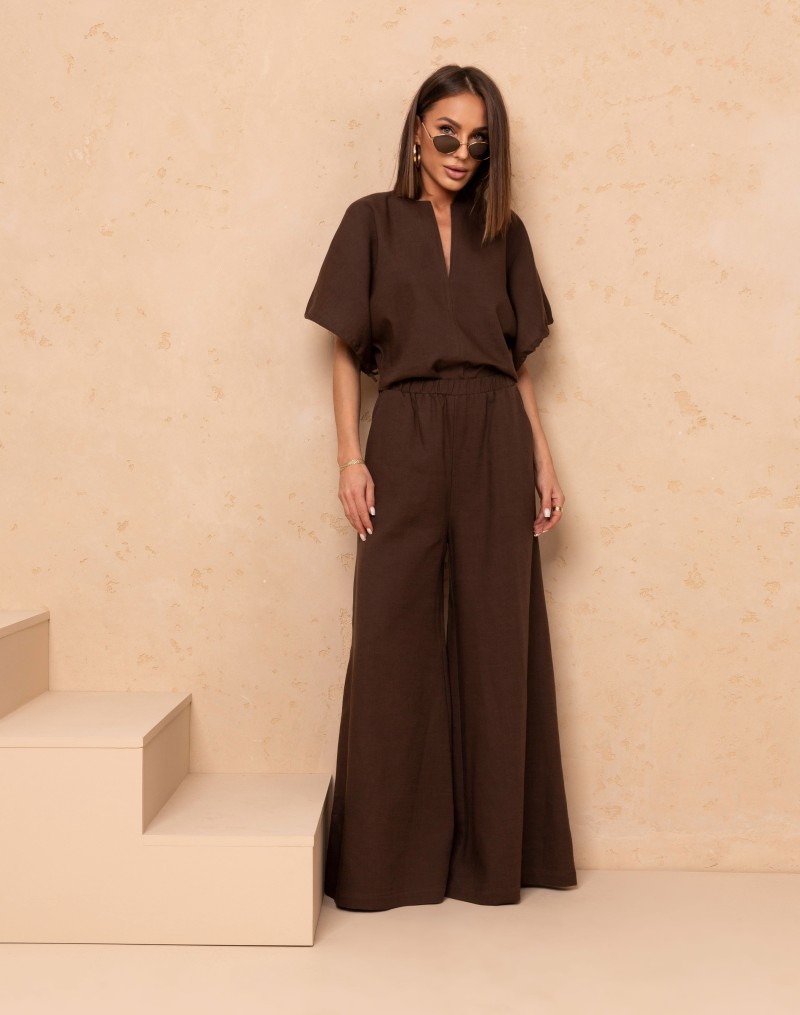 Stylowy i wygodny komplet składający się z luźniejszej bluzki oraz spodni o szerokich nogawkach. Góra ma swobodny krój i krótkie rękawy ze ściągaczem ,dekolt z głębszym wycięciem , które idealnie się układa . Spodnie wyposażone są w elastyczną gumkę w pasie, co zapewnia idealne dopasowanie i komfort noszenia, a dodatkowo posiadają praktyczne kieszenie po bokach. Szerokie nogawki nadają całości lekkości i modnego, niewymuszonego charakteru. To idealny zestaw na co dzień, podróże i letnie dni.