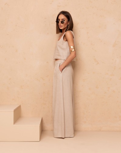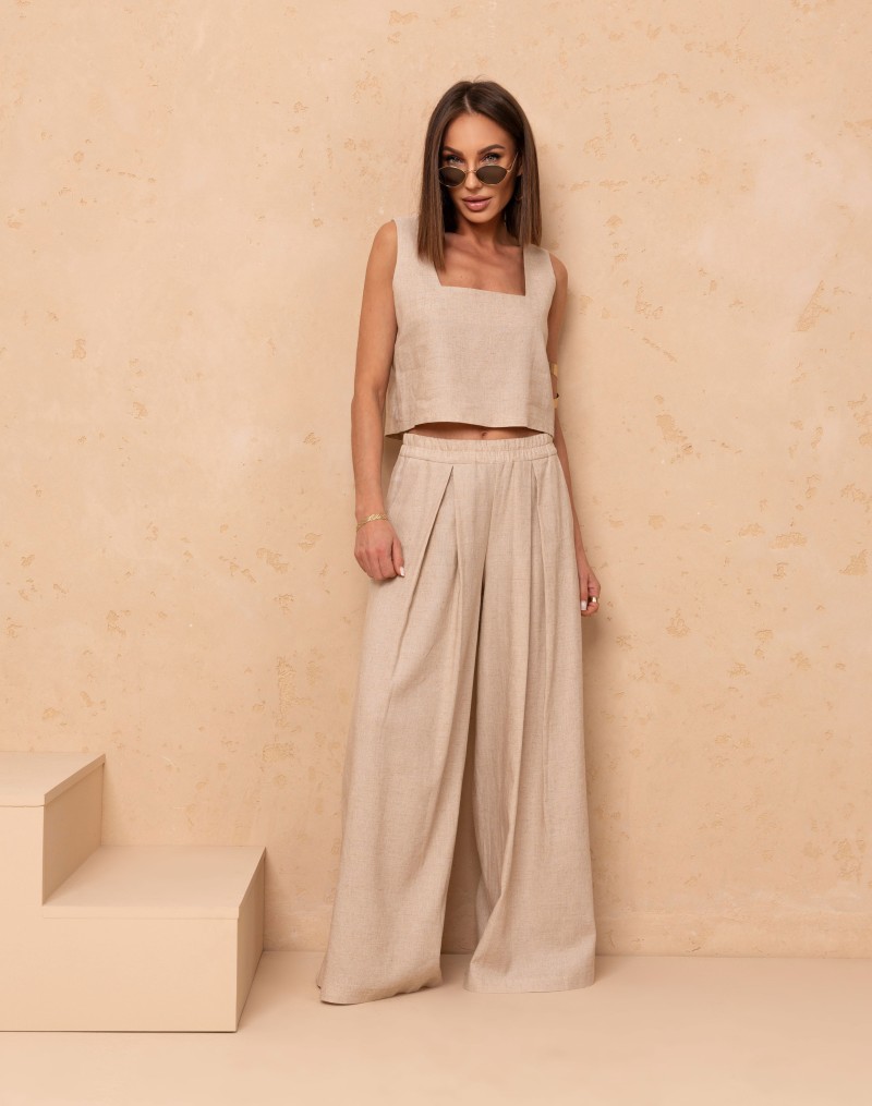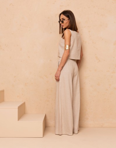 Lekki i stylowy komplet z lnem w składzie ,składający się z luźnego topu na grubych ramiączkach oraz spodni o szerokiej nogawce. Góra z modnym dekoltem karo pięknie podkreśla linię ramion i dodaje całości nowoczesnego charakteru. Spodnie na elastycznej gumie w pasie z praktycznymi kieszeniami oraz efektownymi zakładkami z przodu zapewniają wygodę i swobodę ruchów. Idealny wybór na ciepłe dni, łączący komfort z ponadczasową elegancją.