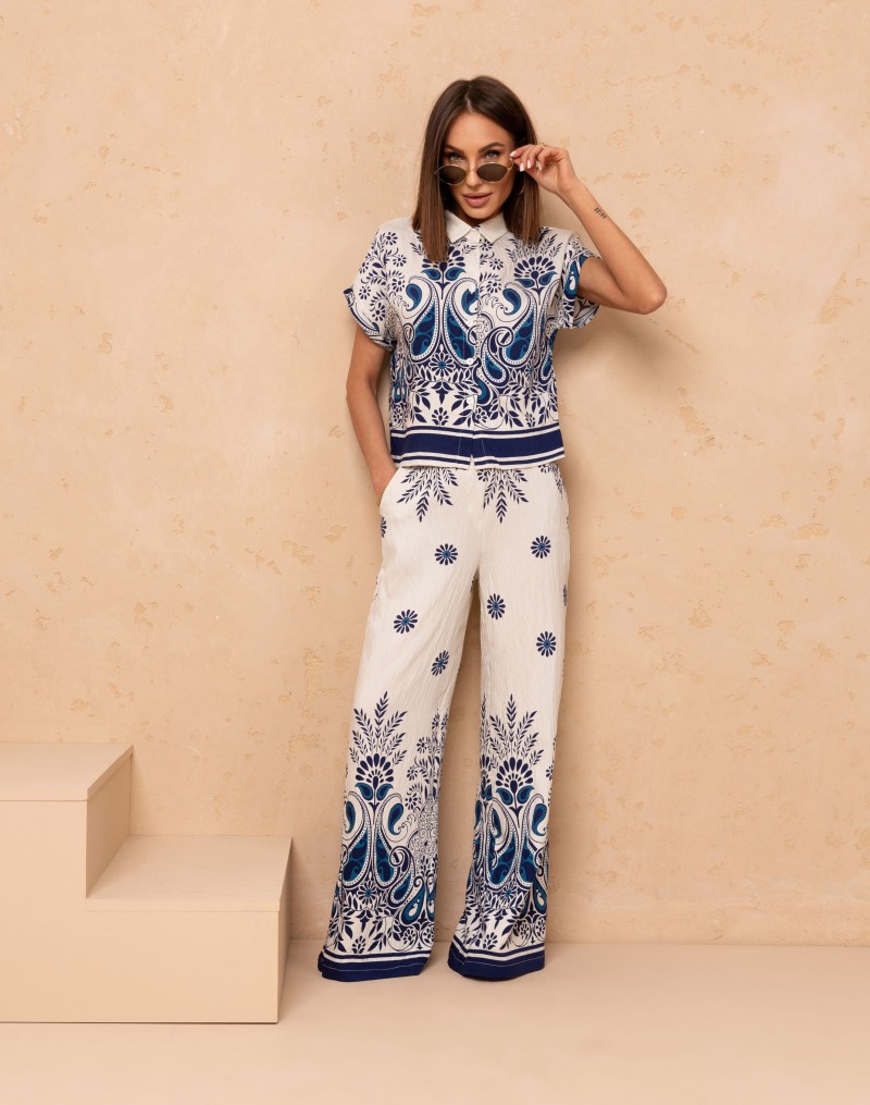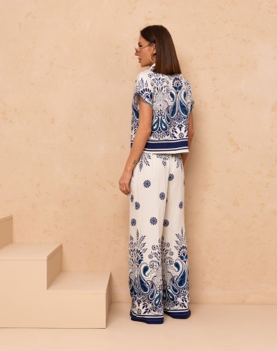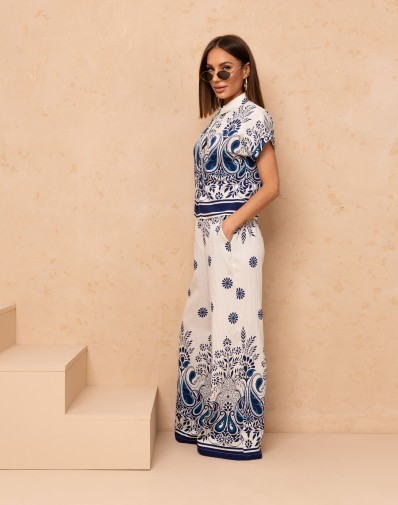 Stylowy komplet damski w klasycznej beżu , składający się z krótszej koszuli oraz luźniejszych spodni. Góra zapinana na guziki z klasycznym kołnierzem i krótkim, lekko podwiniętym rękawem nadaje całości eleganckiego, ale swobodnego charakteru. Spodnie z elastyczną gumą z tyłu w pasie oraz praktycznymi kieszeniami zapewniają komfort noszenia i dopasowanie do sylwetki. Całość zdobią subtelne, niebiesko-błękitne wzory, które dodają wyjątkowości i przyciągają uwagę.