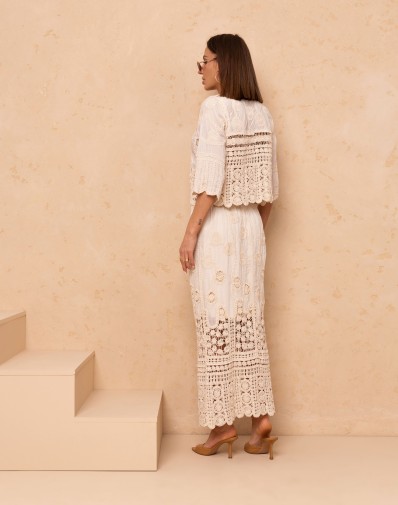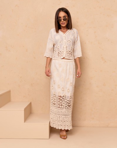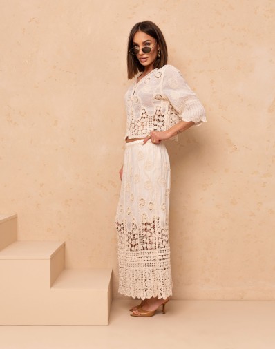 Elegancki komplet 2-częściowy w stylu boho, wykonany z lekkiej, ażurowej tkaniny o dekoracyjnym wzorze. Bluzka o luźnym kroju z rękawem 3/4 posiada klasyczny, okrągły dekolt oraz zapinanie na guziki, co nadaje jej subtelnej kobiecości. Spódnica maxi z wysokim stanem na gumce pięknie podkreśla sylwetkę, a koronkowe wstawki i transparentne detale dodają lekkości i wyjątkowego charakteru. Idealny zestaw na lato, wakacje i stylowe wyjścia.