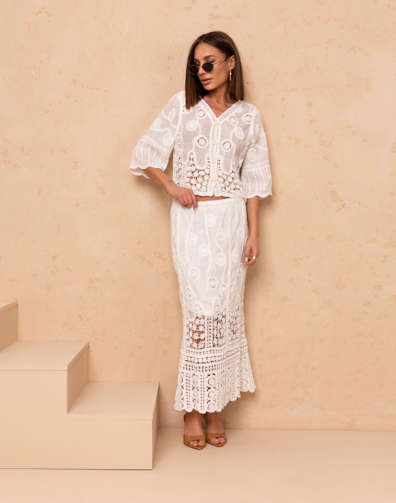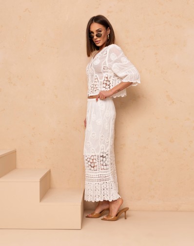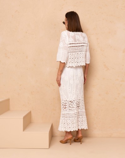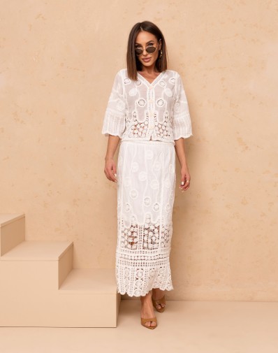 Elegancki komplet 2-częściowy w stylu boho, wykonany z lekkiej, ażurowej tkaniny o dekoracyjnym wzorze. Bluzka o luźnym kroju z rękawem 3/4 posiada klasyczny, okrągły dekolt oraz zapinanie na guziki, co nadaje jej subtelnej kobiecości. Spódnica maxi z wysokim stanem na gumce pięknie podkreśla sylwetkę, a koronkowe wstawki i transparentne detale dodają lekkości i wyjątkowego charakteru. Idealny zestaw na lato, wakacje i stylowe wyjścia.