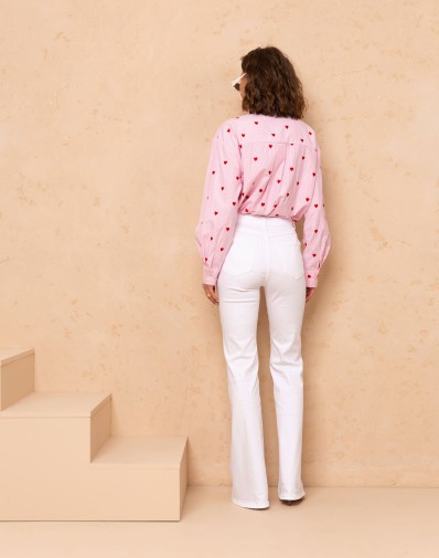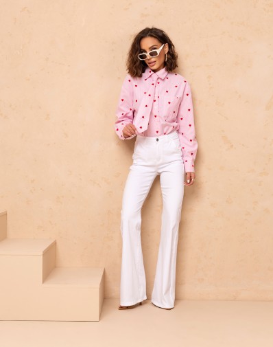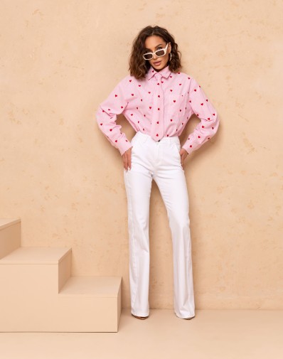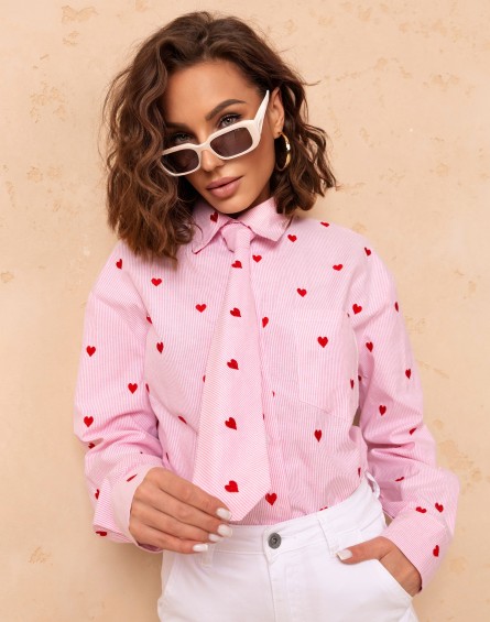 Stylowa koszula o oversize’owym kroju w paski z motywem czerwonych serduszek. Wykonana z miękkiego, przyjemnego w dotyku materiału, który zapewnia wygodę przez cały dzień. Model zapinany na guziki z klasycznym kołnierzykiem i mankietami przy rękawach.W zestawie Krawat w tym samym wzorze .Doskonale sprawdzi się w casualowych stylizacjach – noś ją z jeansami, topem lub jako lekką narzutkę. Idealna propozycja dla miłośniczek miejskiego luzu i modnego stylu vintage.