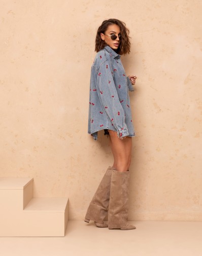 Stylowa bawełniana koszula z jeansowej tkaniny o klasycznym kroju z motywem wyszytych wisienek . Wykonana z miękkiego, przyjemnego w dotyku materiału, który zapewnia wygodę przez cały dzień. Model zapinany na guziki z klasycznym kołnierzykiem i mankietami przy rękawach zapinanych na guziki.Z przodu dwie kieszonki z patkami.Doskonale sprawdzi się w casualowych stylizacjach – noś ją z jeansami, topem lub jako lekką narzutkę.