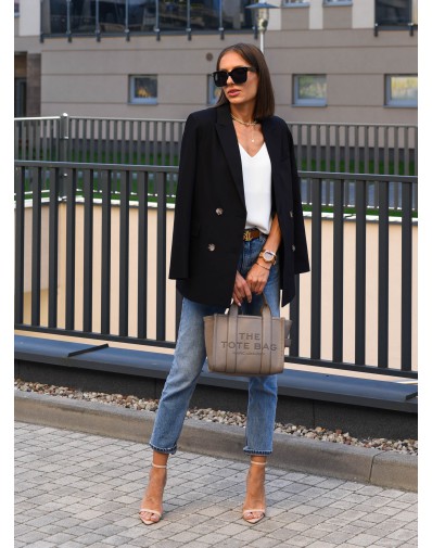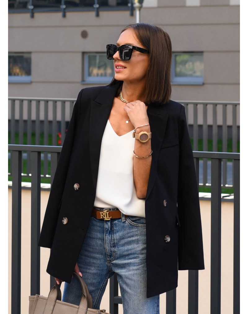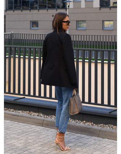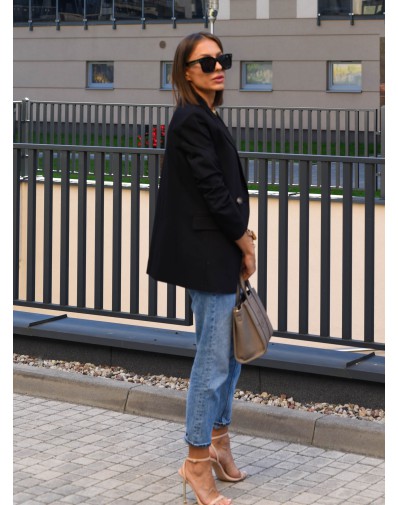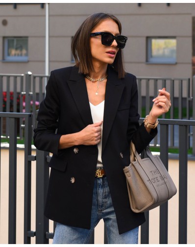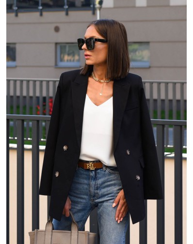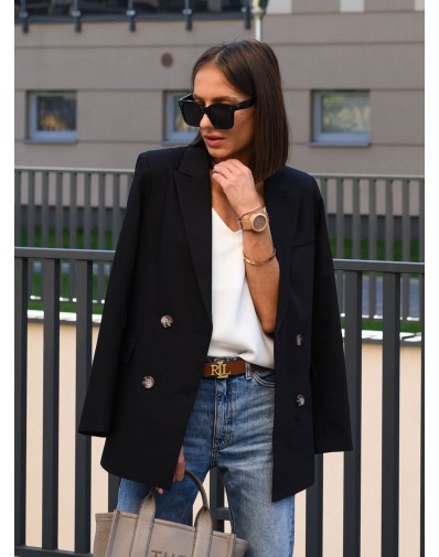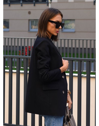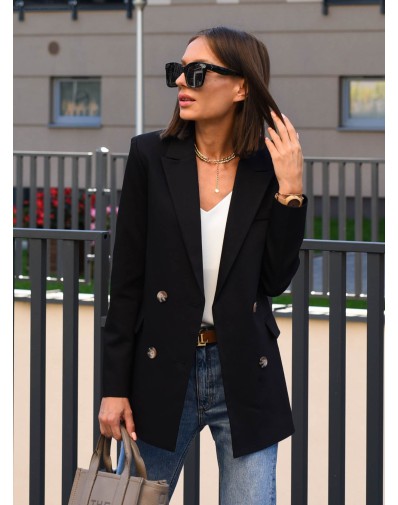 Marynarka dwurzędowa o prostym kroju. Ponadczasowy i elegancki fason. Rękawy długie. Na wysokości bioder ozdobne patki. Klasyczne klapy. Od spodu gładka podszewka.