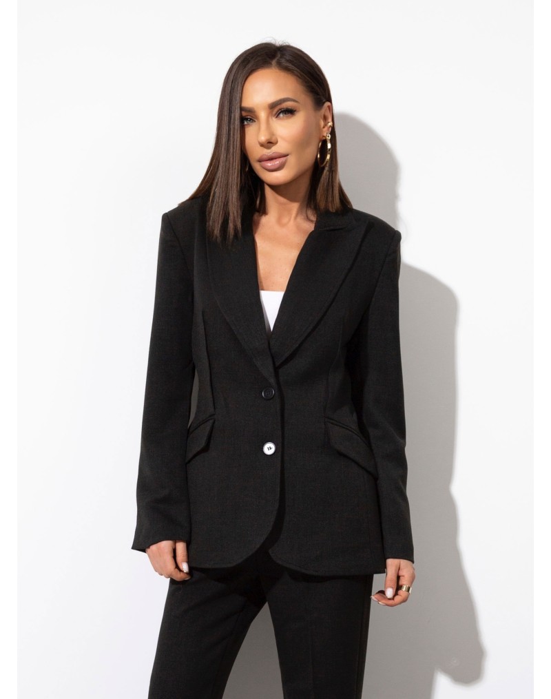 Elegancka Marynarka o lekko dopasowanej talii..Posiada niewielkie poduszki w ramionach,które nadają jej wyrazistego kształtu , zapinana na dwa guziki.Mocno podkreślone klapy,zakładki na przodzie.Polecamy ze spodniami do kompletu z naszej kolekcji.
