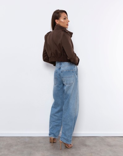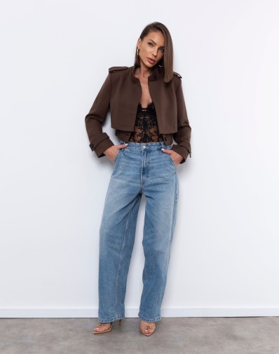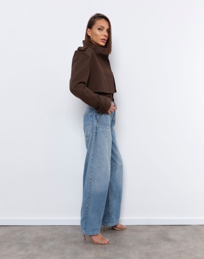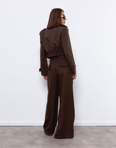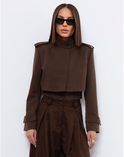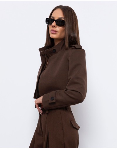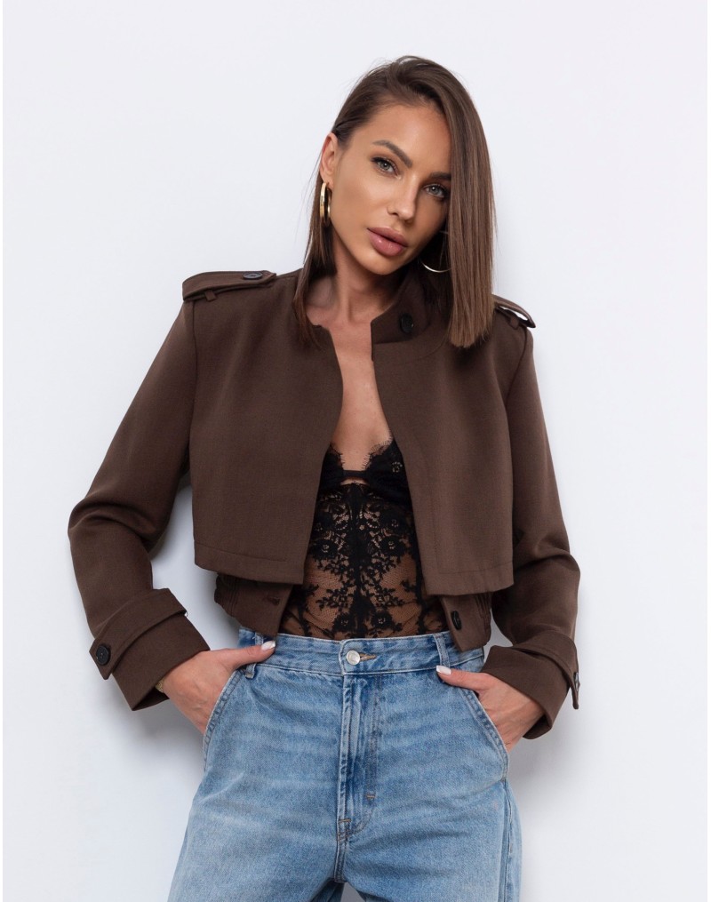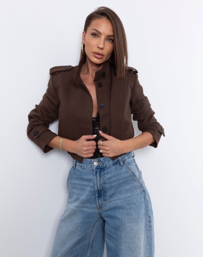 Krótki, elegancki żakiet w kolorze głębokiego brązu o militarnej linii ramion, z ozdobnymi patkami i guzikami. Wykonany z wysokiej jakości, lekko usztywnianego materiału, który pięknie trzyma formę. Model posiada ukryte guziki do zapięcia, dzięki czemu można go nosić zarówno rozpiętego, jak i w bardziej dopasowanej wersji. Posiada poduszki w ramionach.Idealnie komponuje się ze spodniami z wysokim stanem, tworząc nowoczesny, minimalistyczny komplet o wyrazistym charakterze.
