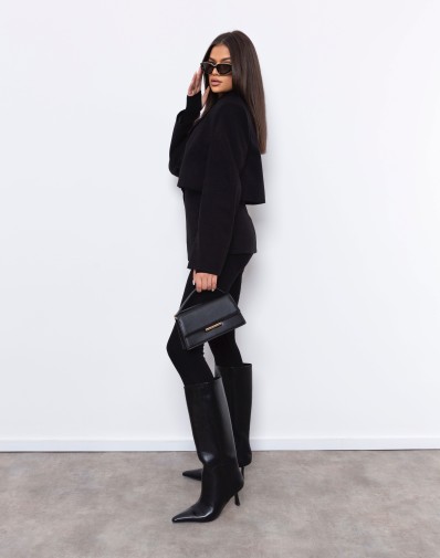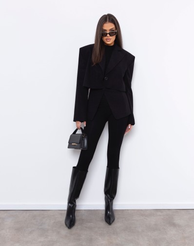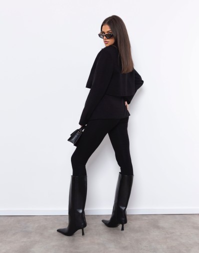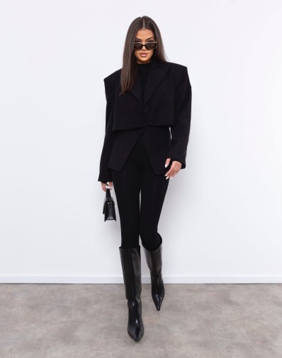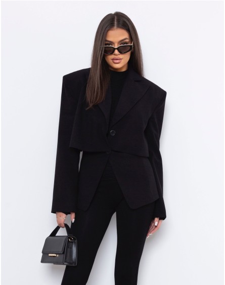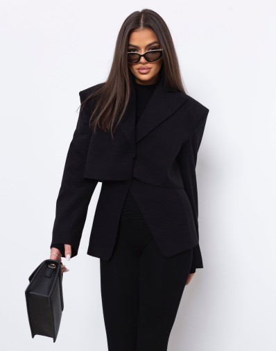 Marynarka o wyjątkowym, taliowanym kroju to połączenie klasyki i nowoczesności. Poszerzane ramiona nadają sylwetce wyrazistości, a efekt „peleryny” tworzy oryginalną, wielowarstwową formę. Górna część marynarki układa się jak krótki, luźny żakiet, spod którego subtelnie wystaje dopasowana warstwa sięgająca bioder. To model, który podkreśla talię i dodaje stylizacji modowego charakteru — idealny zarówno do eleganckich spodni, jak i dopasowanej spódnicy