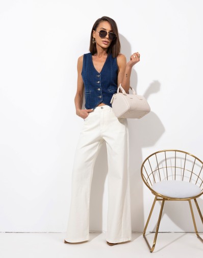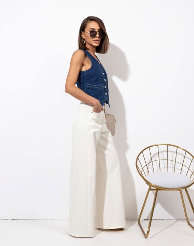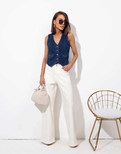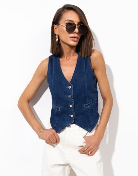 Jeansowa kamizelka wykonana z 75% bawełny ,mięsista i przyjemna dla ciała tkanina.Zapinana na guziki o swobodnym kroju, która zapewnia komfort noszenia i pełną swobodę ruchów. Wykonana z klasycznego denimu, świetnie sprawdzi się jako modny element codziennych stylizacji. Idealna do noszenia warstwowo – pasuje zarówno do sukienek, jak i zestawów z koszulą czy T-shirtem.
