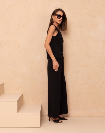 Komplet wykonany z mięsistej wiskozy.Klasyczna kamizelka bez rękawów z dekoltem w serek podkreślający szyję.Kamizelka zapinana na złote napy w kształcie muszelek,które nadają kamizelce subtelnej elegancji i wyjątkowego charakteru.Dół prosty , spodnie na grubszej gumie , delikatnie rozszerzana nogawka.Brak kieszeni.Komplet tworzy elegancką a zarazem komfortową stylizację na wiele okazji.