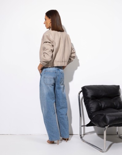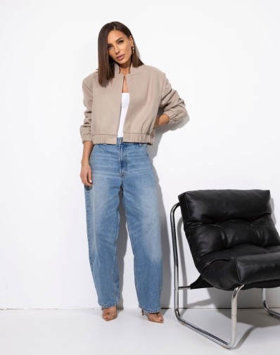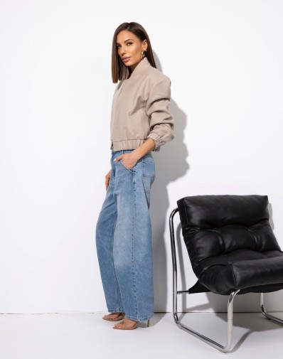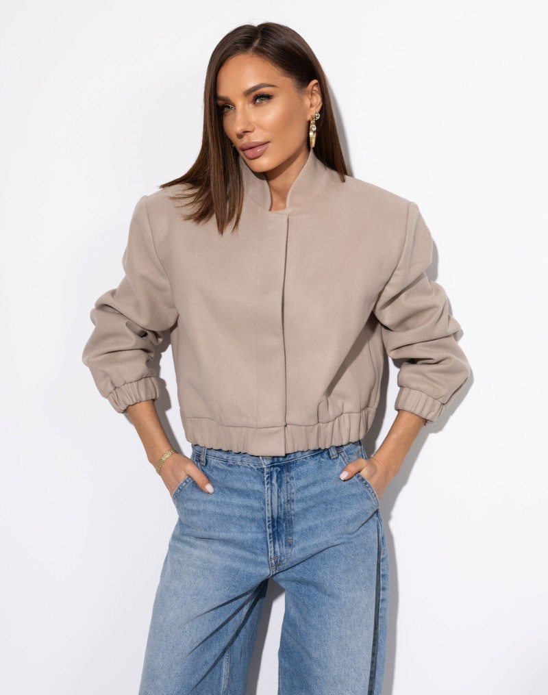 Kurtka bomber z obniżoną linią ramion. Zapinana na ukryte magnesy. Od spodu podszewka. W szwach bocznych kieszenie.
