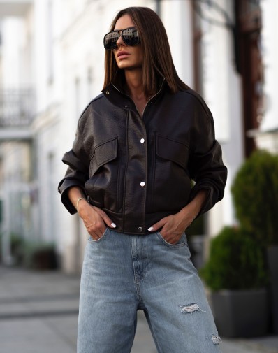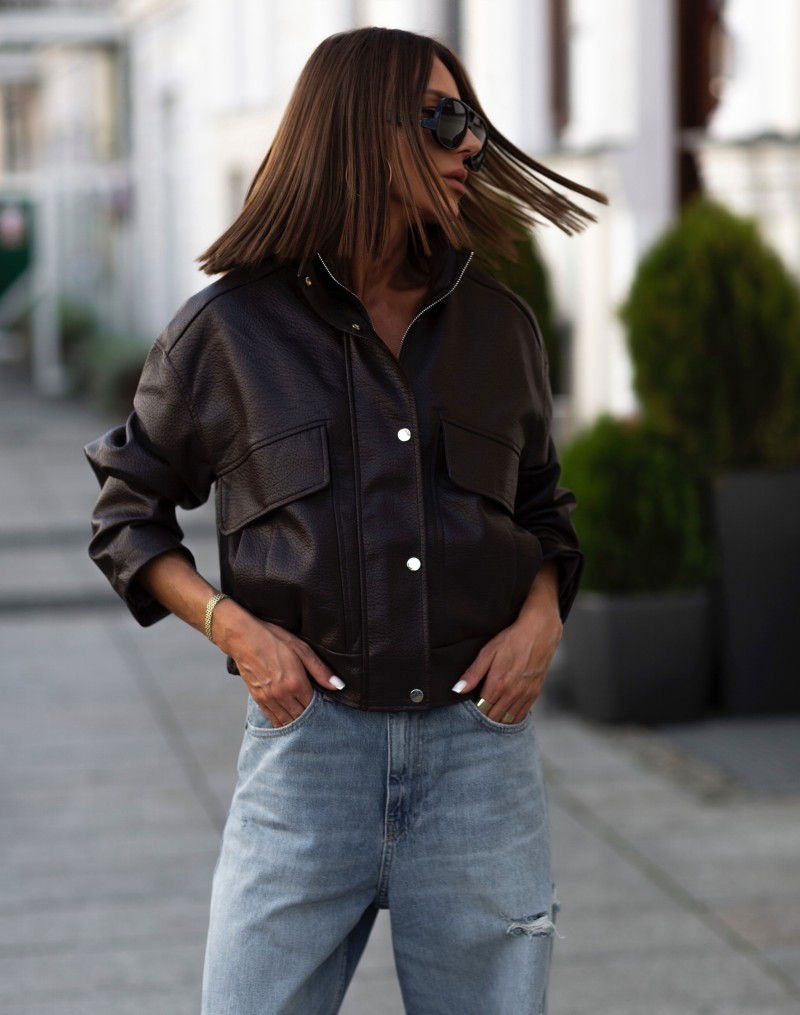 Stylowa kurtka z eko skóry, która łączy nowoczesny design z wygodą noszenia. Model z opadającą linią ramion i szerszymi rękawami nadaje sylwetce swobodnego, modnego charakteru. Zapinana na zamek oraz napy, z klasycznym kołnierzem i praktycznymi kieszeniami z przodu.Elastyczna guma w pasie podkreśla figurę i zapewnia komfort, dzięki czemu kurtka świetnie układa się na ciele. To idealny wybór do codziennych stylizacji – sprawdzi się zarówno w casualowym wydaniu z jeansami, jak i w bardziej kobiecych zestawach z sukienką.