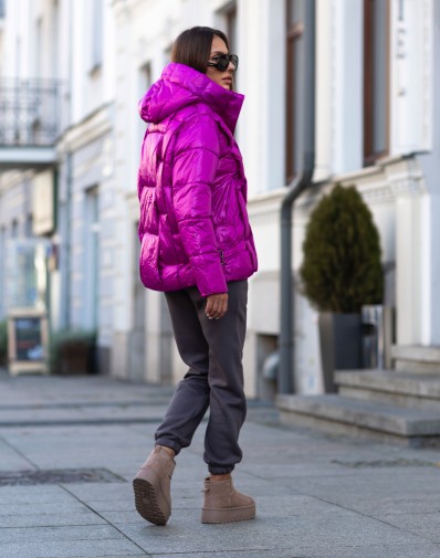 Stylowa puchowa kurtka z dużym, ciepłym kapturem to idealny wybór na chłodne dni. Model zapinany na zamek oraz napy, posiada praktyczne kieszenie po bokach. Jej wyrazista, pikowana struktura nie tylko przyciąga wzrok, ale też nadaje całości nowoczesny, dynamiczny wygląd. Dodatkowego charakteru dodają ozdobne klamry umieszczone po bokach. Kurtka świetnie sprawdzi się zarówno na co dzień, jak i w sportowych stylizacjach.