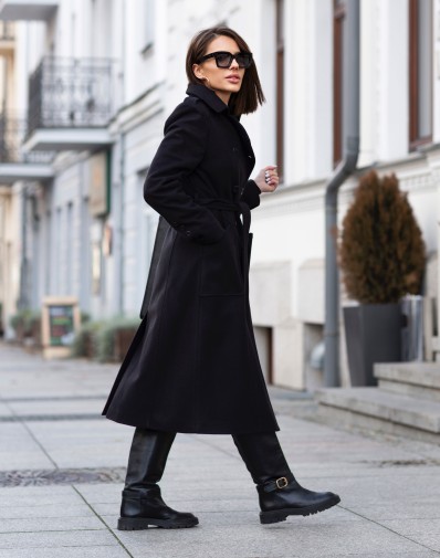 Wygodny i ciepły płaszcz zapinany na duże guziki. Nie krępuje ruchów. Na wysokości bioder z przodu dwie kieszenie. Tył bez rozcięcia. Przewiązywany paskiem. Klapy mogą być noszone otwarte lub zapinane jako kołnierz. Od spodu podszewka z ociepleniem pikowana.ZALECAMY ZAKUP O JEDEN ROZMIAR WIĘKSZY