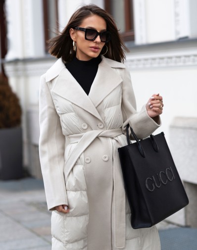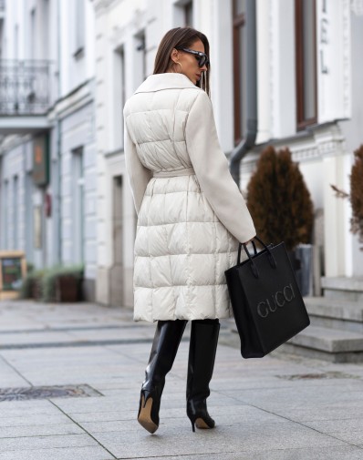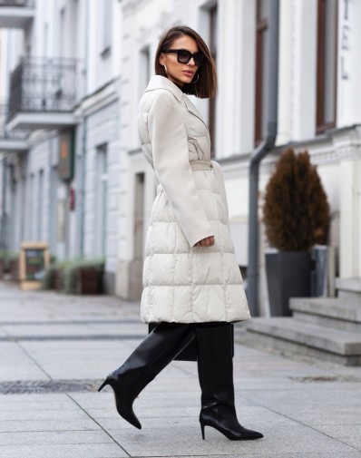 Płaszcz z szalowym kołnierzem wykonany z miękkiego wełnianego flauszu z dodatkiem kaszmiru. Delikatnie ocieplany kaczym pierzem. Przewiązywany paskiem oraz zapinany na dwa rzędy guzików.