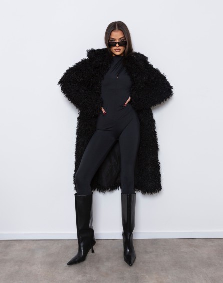 Stylowe, długie futro w głębokim odcieniu czekoladowego brązu to idealny wybór na chłodniejsze dni. Wykonane z miękkiego, puszystego materiału, który nadaje całości luksusowego charakteru. Model posiada wiązanie w talii, dzięki czemu pięknie podkreśla sylwetkę, a luźny krój zapewnia wygodę i swobodę ruchów. Świetnie prezentuje się zarówno w codziennych, jak i wieczorowych stylizacjach.