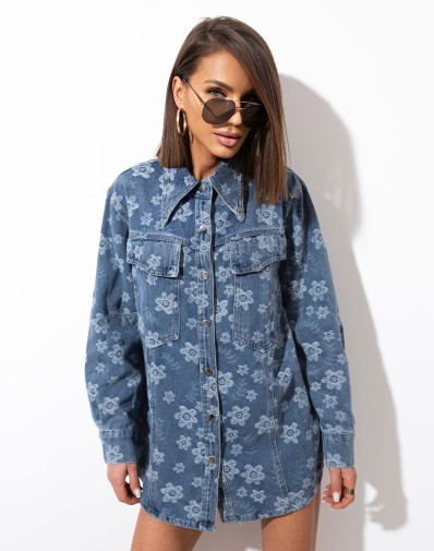 Jeansowa koszula w subtelny, kwiatowy wzór to idealne połączenie klasyki z kobiecym akcentem. Wykonana z miękkiego denimu, pięknie układa się na sylwetce i zapewnia komfort noszenia przez cały dzień. Zapinana na napy, z dwiema kieszeniami na piersi oraz klasycznym kołnierzykiem, sprawdzi się zarówno jako koszula, jak i lekka narzutka.Noś ją do jeansów, szortów lub zarzuć na top – stworzy modny, swobodny look w stylu casual z nutą romantyczności