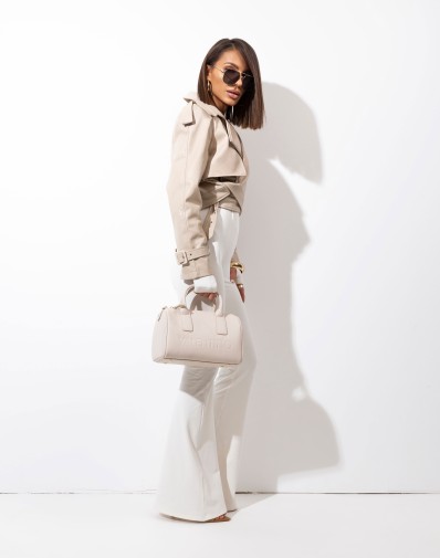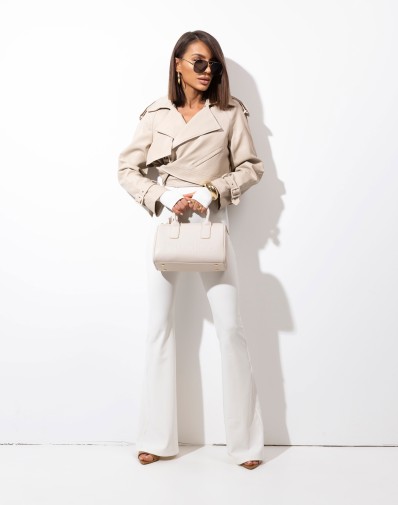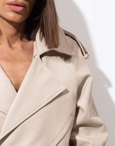 CZAS WYSYŁKI DO 7 DNI ROBOCZYCH Beżowa ramoneska z miękkiej, wysokiej jakości eko skóry w eleganckim, krótkim kroju. Minimalistyczna forma bez zapięcia nadaje jej lekkości i nowoczesnego charakteru. Szeroki kołnierz, pagony oraz regulowany pasek podkreślają dopracowane detale i luksusowy wygląd modelu.Ponadczasowy fason, który subtelnie podkreśla sylwetkę i doskonale uzupełni zarówno codzienne, jak i bardziej eleganckie stylizacje.