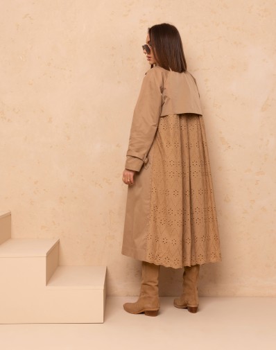 Elegancki karmelowy trencz midi, idealny na wiosnę . Model zapinany na guziki. Posiada stylowy kołnierz z patką z jednej strony oraz praktyczne kieszenie po bokach, które dodają funkcjonalności. W zestawie znajduje się pasek w tym samym kolorze, umożliwiający podkreślenie talii i nadanie całości charakteru.Z tyłu po długości wstawiona ozdobna haftowana tkanina , która dodaje stylowego akcentu.To doskonały wybór dla kobiet ceniących sobie modę i wygodę.