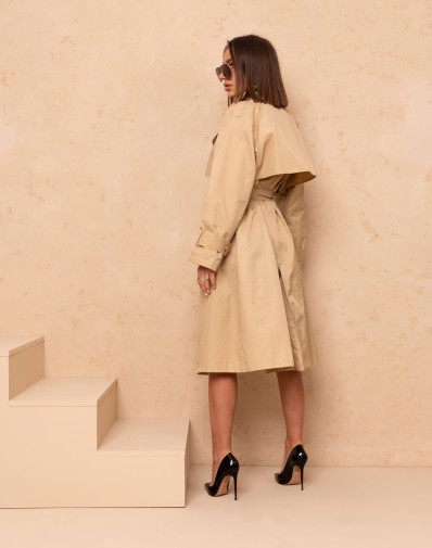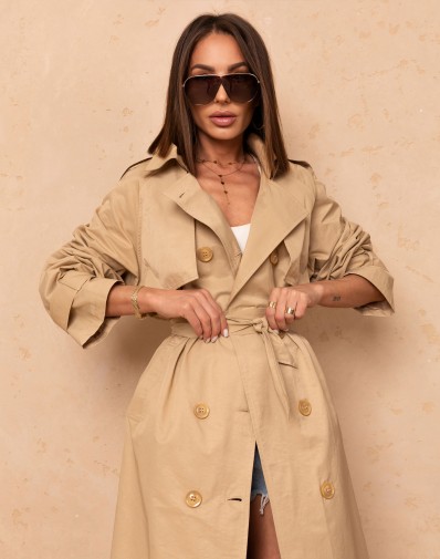 Camelowy trencz midi to elegancka propozycja na każdą porę roku. Zapinany na dwurzędowe guziki,patki na przodzie oraz na plecach , łączy w sobie styl i funkcjonalność. Na ramionach pagony , rękawy zakończone ozdobnym guzikiem z paskiem.Po bokach znajdują się praktyczne kieszenie, a dodatkowy pasek w tym samym kolorze podkreśla talię, nadając sylwetce piękny kształt. Model z podszewką.Idealny do zestawień zarówno casualowych, jak i bardziej formalnych.