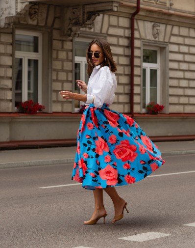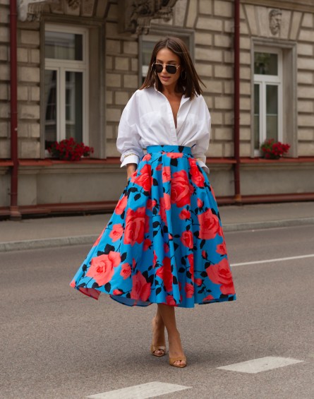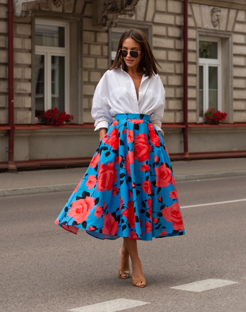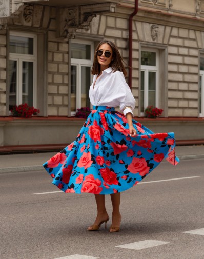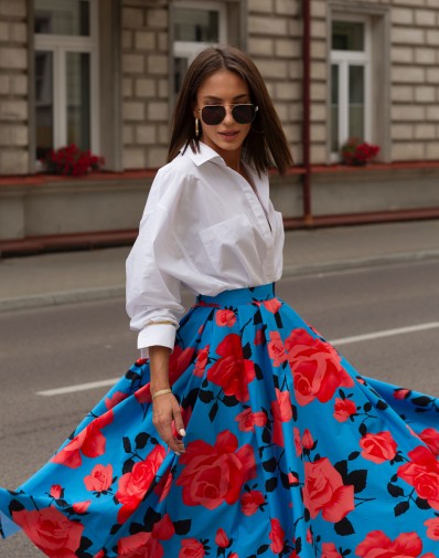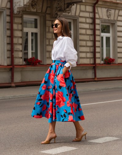 Spódnica midi z kontrafałdami – wyjątkowy model, który łączy elegancję i wygodę. Uszyta z koła, pięknie układa się w ruchu, a kontrafałdy dodają jej lekkości i objętości. Zachwyca przepięknym kwiatowym wzorem na niebieskim tle, który przyciąga spojrzenia i podkreśla kobiecy charakter. Po bokach posiada praktyczne kieszenie, a z tyłu – kryty zamek, zapewniający estetyczne wykończenie. Doskonała zarówno na co dzień, jak i na wyjątkowe okazje.