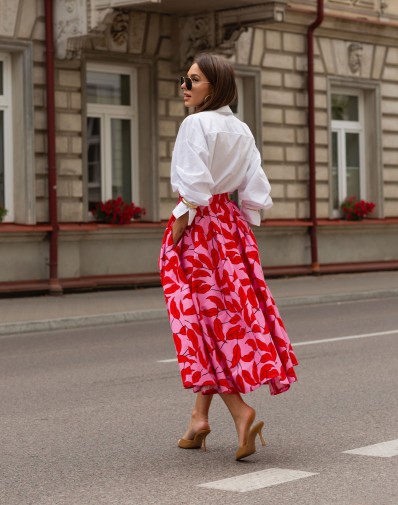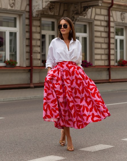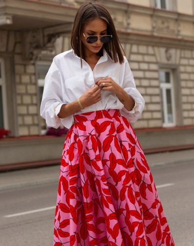 Spódnica midi z kontrafałdami – wyjątkowy model, który łączy elegancję i wygodę. Uszyta z koła, pięknie układa się w ruchu, a kontrafałdy dodają jej lekkości i objętości. Zachwyca przepięknym kwiatowym wzorem na różowym tle, który przyciąga spojrzenia i podkreśla kobiecy charakter. Po bokach posiada praktyczne kieszenie, a z tyłu – kryty zamek, zapewniający estetyczne wykończenie. Doskonała zarówno na co dzień, jak i na wyjątkowe okazje.