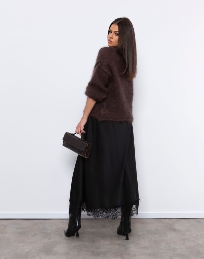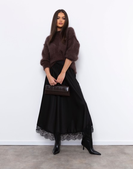 Spódnica wykonana z delikatnej tkaniny satynowej o subtelnym połysku. Model o długości midi, lekko rozszerzany ku dołowi, dzięki czemu ładnie układa się w ruchu. Dół spódnicy został wykończony koronką wszytą dookoła obwodu. W pasie z przodu gładka, natomiast z tyłu posiada wszytą gumę, co zapewnia wygodne dopasowanie do sylwetki. Po bokach znajdują się praktyczne, wpuszczane kieszenie.