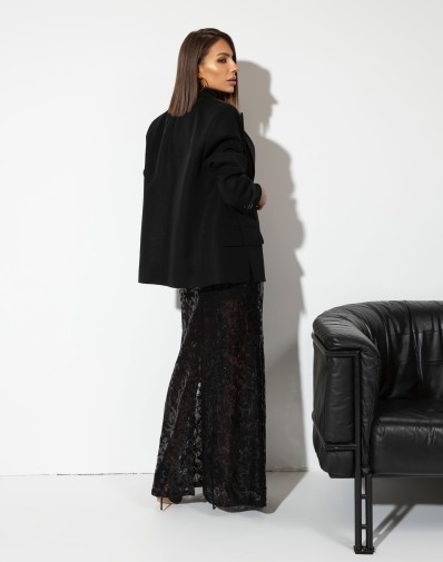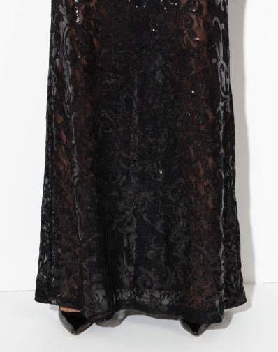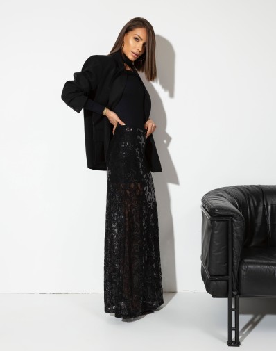 Długa, efektowna spódnica o eleganckim połysku, idealna na wyjątkowe okazje. Dopasowana w talii, pięknie podkreśla sylwetkę i subtelnie rozszerza się ku dołowi, tworząc zgrabną linię. Wykonana z koronkowej tkaniny zdobionej cekinami ,która przy każdym ruchu delikatnie mieni się, dodając całości szyku i blasku. Spódnica zapinana z tyłu na zamek