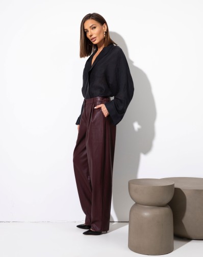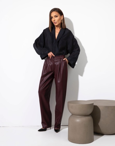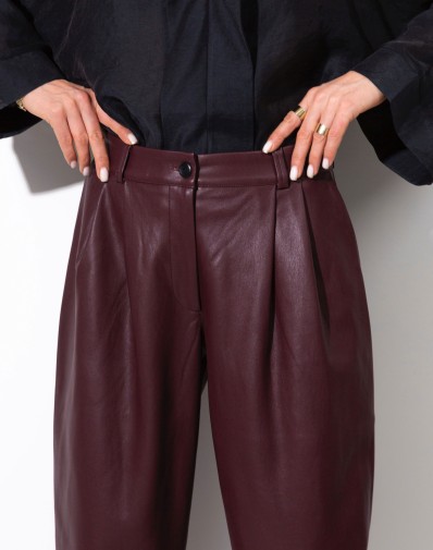 Spodnie ze sztucznej skóry z zakładkami i bacznymi kieszeniami. Zapinane na klasyczny zamek i guzik. W pasie szlufki. Nogawka prostaModelka mierzy 168cm i prezentuje roz. XSMATERIAŁ: 100%poliesterPOKRYCIE: 100% poliuretanPRODUKT POLSKI