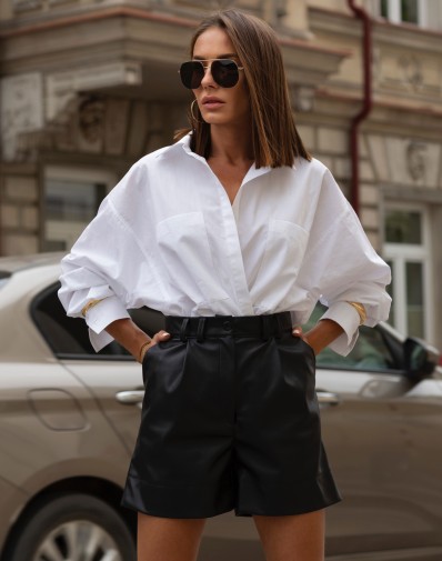 Czarne spodenki ze sztucznej skóry – stylowy must-have w Twojej garderobie. Wykonane z miękkiej, imitującej skórę tkaniny, zapewniają efektowny wygląd i wygodę noszenia. Zapinane na zamek, z praktycznymi szlufkami w pasie, idealne do ulubionego paska. Długość do połowy uda podkreśla nogi i dodaje odważnego charakteru każdej stylizacji.