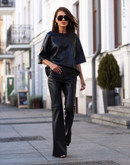 Stylowe spodnie wykonane z wysokiej jakości eko skóry , zapinane klasycznie na zamek i guzik. Fason z dopasowaną górą, który pięknie podkreśla sylwetkę, a nogawki rozszerzające się ku dołowi nadają całości nowoczesny, elegancki charakter. Idealne na co dzień, jak i na wieczorne wyjścia. Do kompletu dostępna jest również bluzka z tej samej tkaniny, tworząc spójną i modną stylizację.