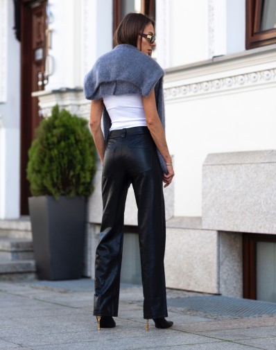 Podkreśl swoją sylwetkę i dodaj stylizacji nutę elegancji z naszymi czarnymi spodniami ze skóry ekologicznej. Wykonane z wysokiej jakości materiału, idealnie dopasowują się do ciała, a ozdobne przeszycia z przodu optycznie wydłużają nogi. Model posiada wysoki stan, klasyczne zapięcie na guzik i suwak, oraz praktyczne szlufki na pasek. Prosty, lekko rozszerzany fason doskonale sprawdzi się zarówno w stylizacjach dziennych, jak i wieczorowych.