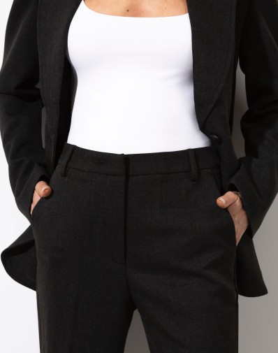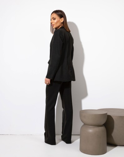 Stylowe spodnie wykonane z wysokiej jakości tkaniny, zapinane klasycznie na zamek i guzik. Fason z dopasowaną górą, który pięknie podkreśla sylwetkę, a nogawki rozszerzające się ku dołowi nadają całości nowoczesny, elegancki charakter. Idealne na co dzień, jak i na wieczorne wyjścia. Do kompletu dostępna jest również marynarka z tej samej tkaniny, tworząc spójną i modną stylizację.