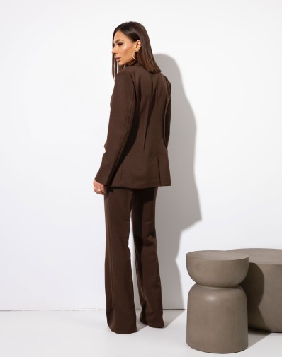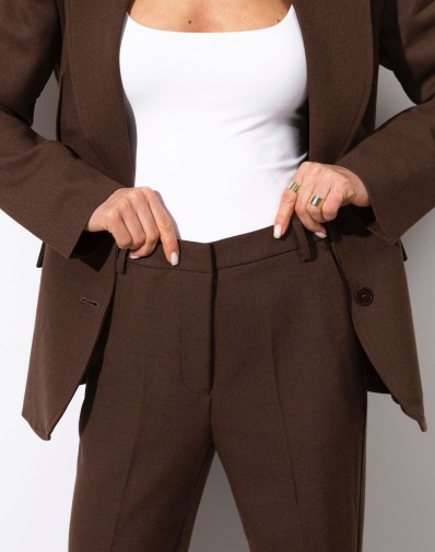 Stylowe spodnie wykonane z wysokiej jakości tkaniny, zapinane klasycznie na zamek i guzik. Fason z dopasowaną górą, który pięknie podkreśla sylwetkę, a nogawki rozszerzające się ku dołowi nadają całości nowoczesny, elegancki charakter. Idealne na co dzień, jak i na wieczorne wyjścia. Do kompletu dostępna jest również marynarka z tej samej tkaniny, tworząc spójną i modną stylizację.