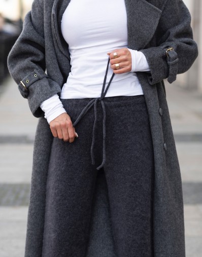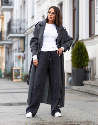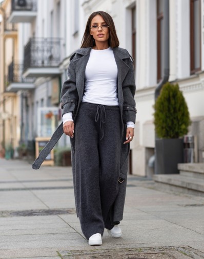 Spodnie z szeroką nogawką wykonane z miękkiego i puszystego kid moheru. Niezwykle ciepłe, lekkie i przyjemne w dotyku, zapewniają maksymalny komfort w chłodniejsze dni. W pasie elastyczna gumka ze sznurkiem umożliwia idealne dopasowanie do sylwetki. Model bez kieszeni, o swobodnym kroju, który łączy elegancję z wygodą.Rozciągają się .