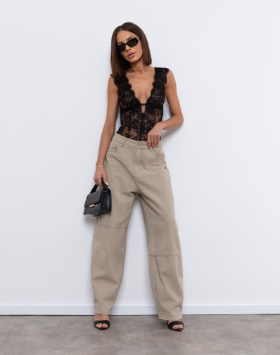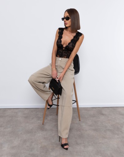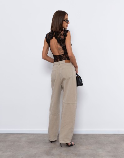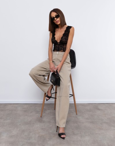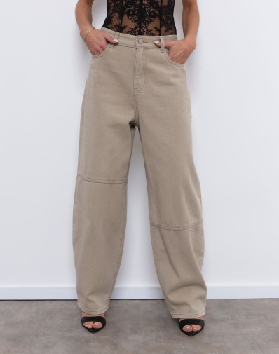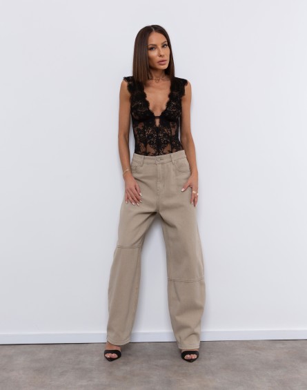Te spodnie to idealne połączenie wygody i stylu. Uszyte z miękkiej, ale trwałej tkaniny w głębokiej czerni, wyróżniają się prostym, lekko luźnym krojem, który pięknie układa się na sylwetce. Wysoki stan optycznie wydłuża nogi i podkreśla talię, a klasyczne kieszenie nadają im ponadczasowego charakteru. To model, który doskonale sprawdzi się zarówno w casualowych, jak i bardziej eleganckich stylizacjach – wystarczy dodać szpilki albo sneakersy.