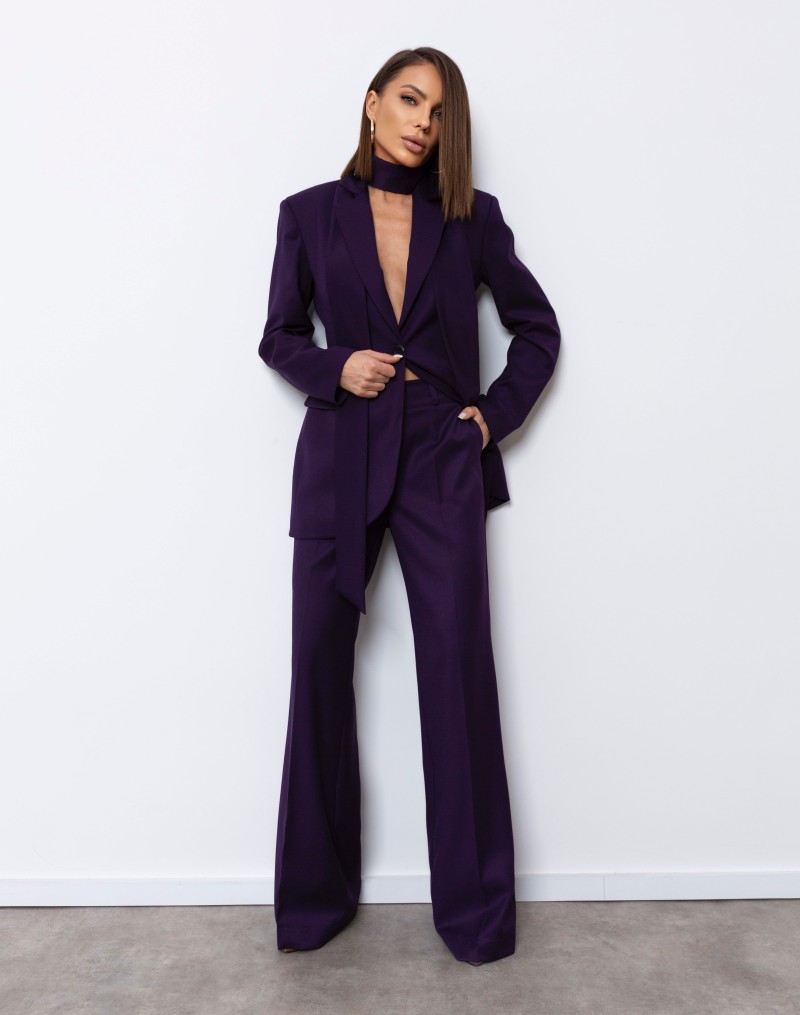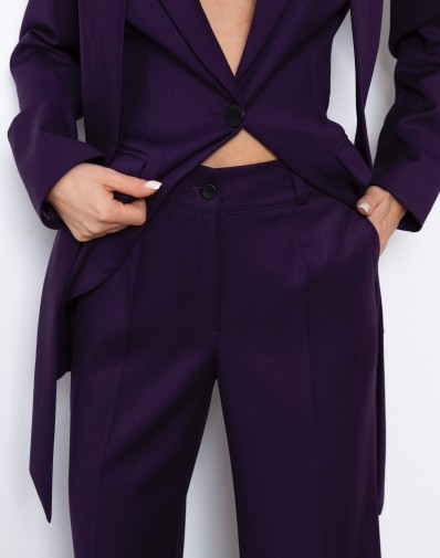 Spodnie z rozszerzaną nogawką. W pasie szlufki. Przód zapinany na klasyczne zapięcie. Z przodu wsuwane kieszenie. Z tyłu patki. Skompletujesz je z naszymi marynarkami z paskiem .