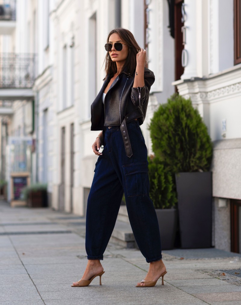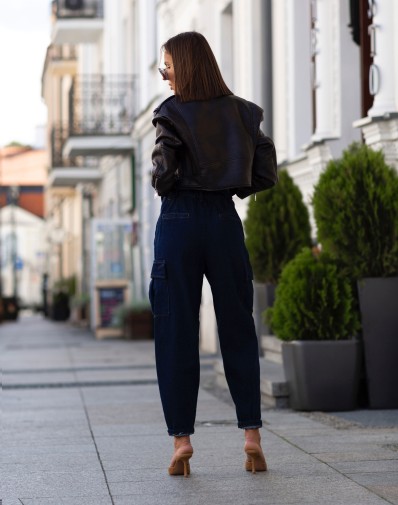 Nowoczesne jeansy cargo w odcieniu ciemnego denimu to must-have dla każdej miłośniczki miejskiego stylu. Wysoki stan i lekko zwężane nogawki podkreślają sylwetkę, a pojemne kieszenie z klapami dodają funkcjonalności i charakteru. W pasie gumka dzięki czemu spodnie idealnie dopasowują się do sylwetki.Model łączy wygodę z modnym krojem – świetnie wygląda zarówno ze szpilkami, jak i sneakersami.