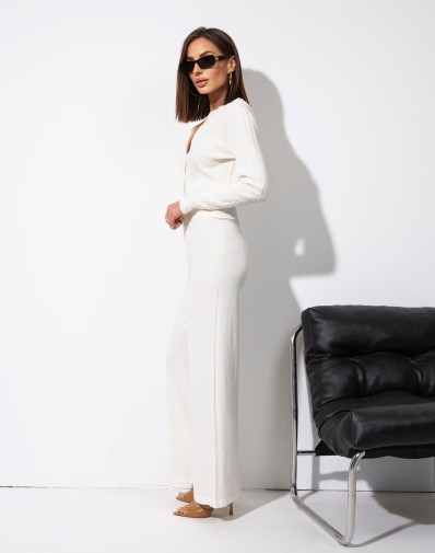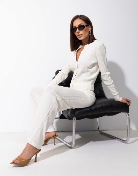 Komplet sweterkowy składający się z dopasowanego sweterka zapinanego na guziki z długim rękawem i ozdobnym plecionym splotem oraz spodni na elastycznej gumce. Spodnie o szerokiej nogawce, gładkie, bez kieszeni, wyróżniają się plecionym lampasem po bokach nawiązującym do wzoru sweterka. Stylowy i wygodny zestaw idealny na co dzień, wyjścia ze znajomymi czy luźny dzień w domu.