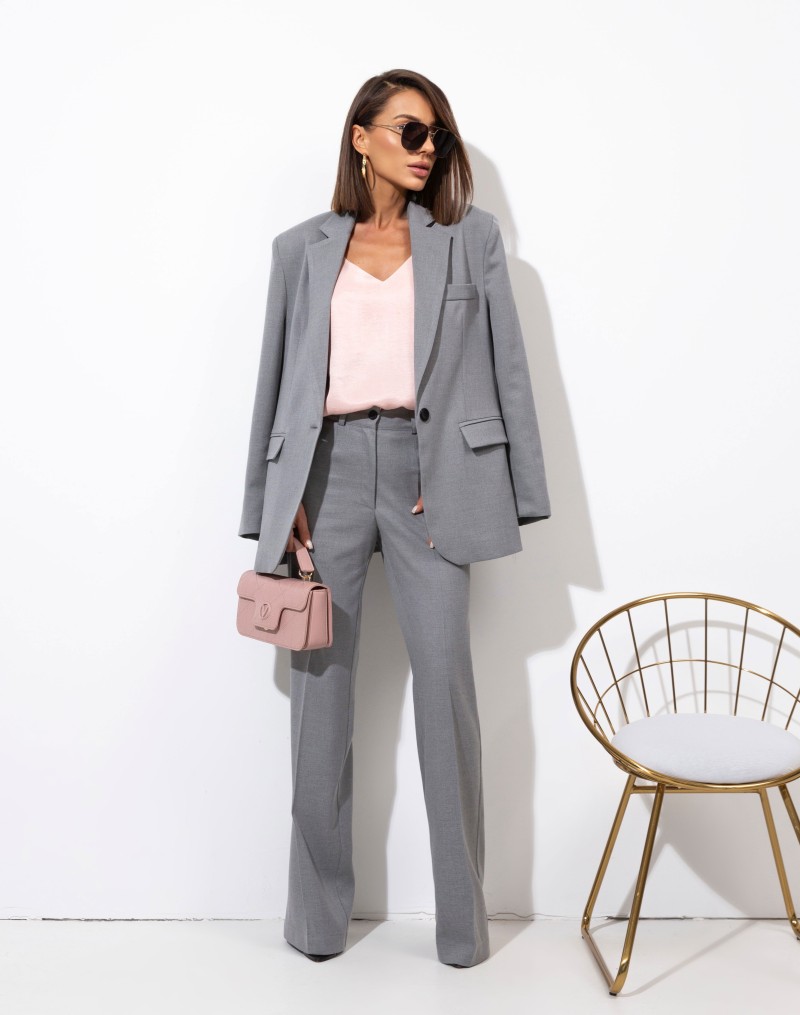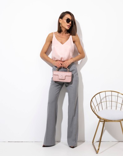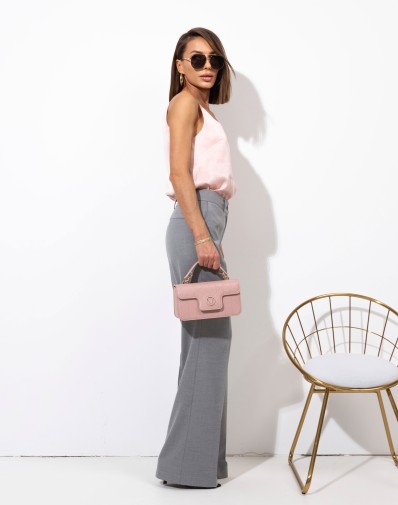 Spodnie z rozszerzaną nogawką. W pasie szlufki. Przód zapinany na klasyczne zapięcie. Z przodu wsuwane kieszenie. Z tyłu patki. Skompletujesz je z naszymi marynarkami KARMEN.