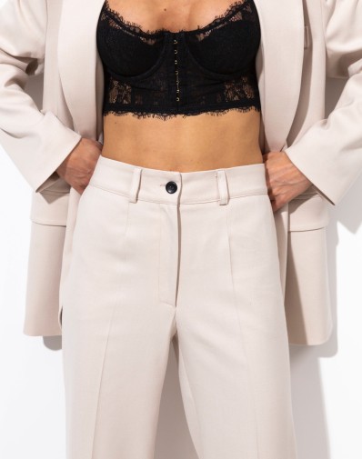 Spodnie z rozszerzaną nogawką. W pasie szlufki. Przód zapinany na klasyczne zapięcie. Z przodu wsuwane kieszenie. Z tyłu patki. Skompletujesz je z naszymi marynarkami KARMEN.