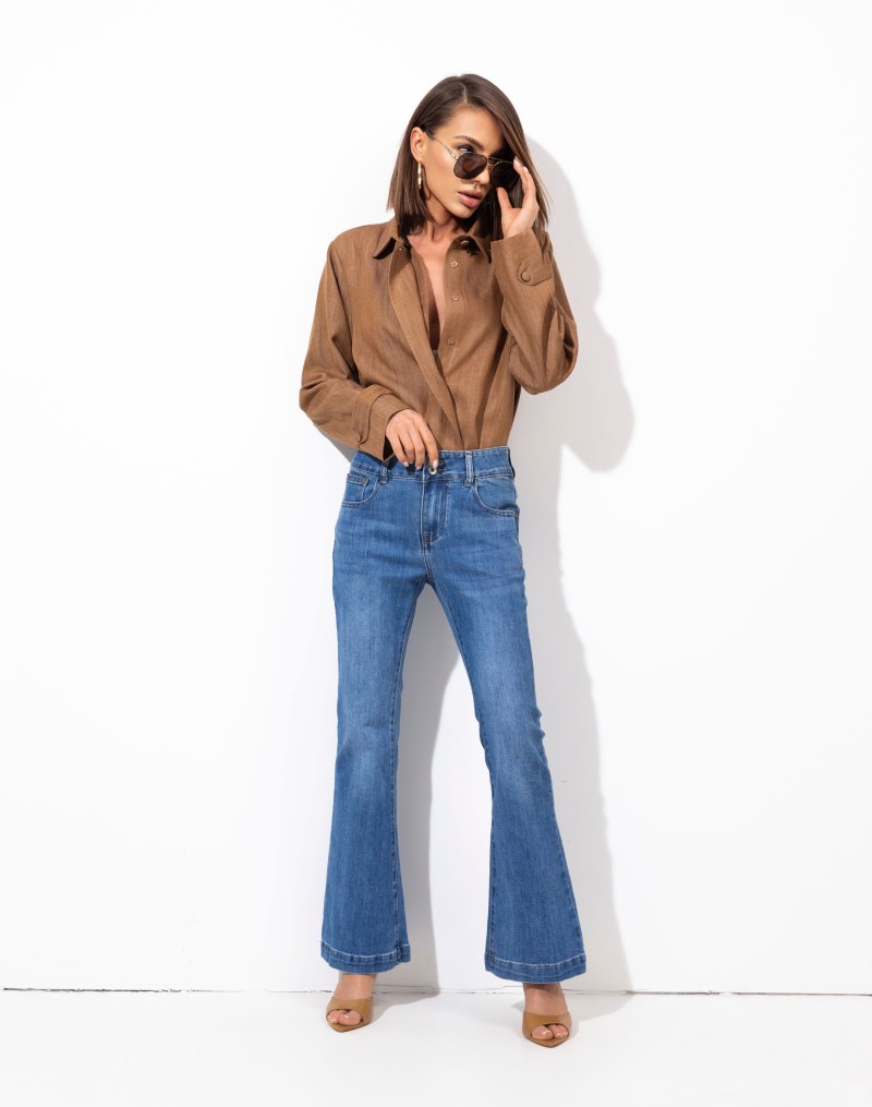 Jeansowe spodnie z wysokim stanem w klasycznym niebieskim kolorze. Dopasowane w biodrach i udach, lekko rozszerzane ku dołowi . Zapinane na dwa guziki, z kieszeniami. Wykonane z elastycznego denimu, który ładnie podkreśla sylwetkę i zapewnia komfort noszenia na co dzień.
