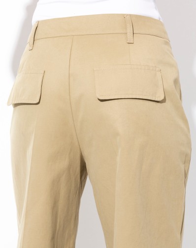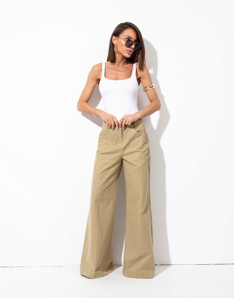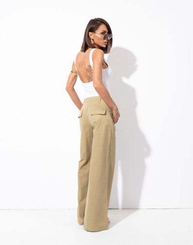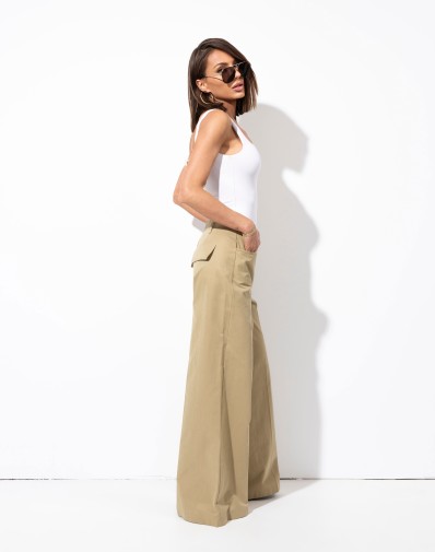 Bawełniane spodnie z szerokimi nogawkami.Zapinane na zamek i guzik.W pasie szlufki , na bokach praktyczne kieszenie. Z tyłu patki.Wykonane z materiału o stabilnej strukturze, który doskonale trzyma fason i nadaje stylizacji elegancki charakter.